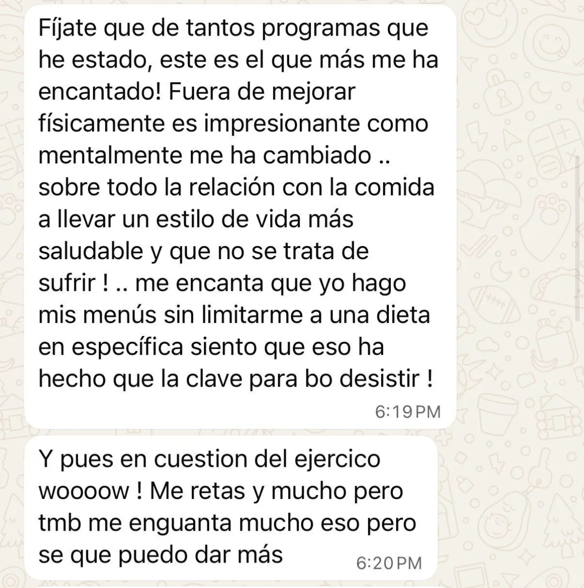 Mientras trabajas en perder grasa corporal, construir masa muscular, verte más firme, tonificada y definida, volver a sentirte cómoda, femenina y segura en tu cuerpo, y recuperar tu disciplina y enfoque mental.
